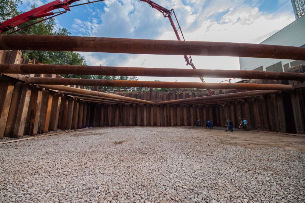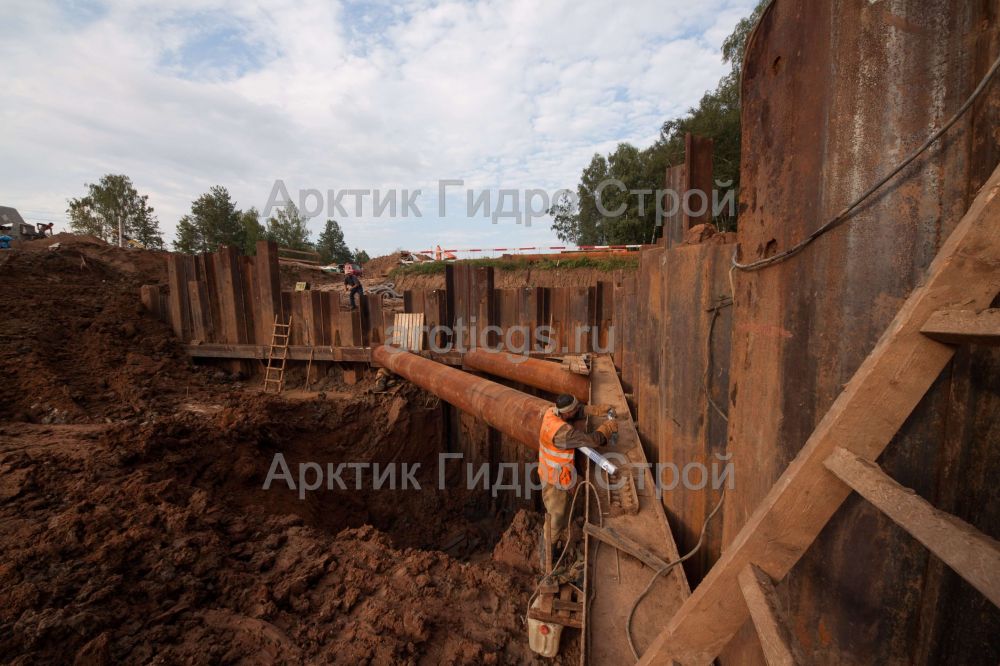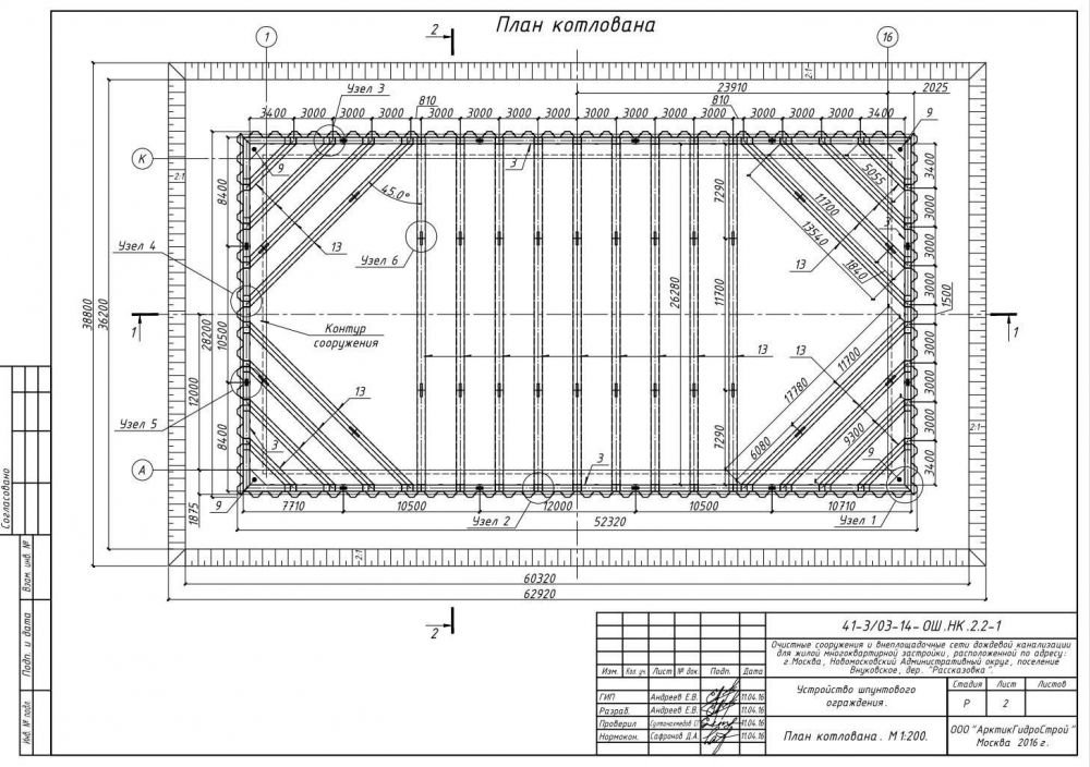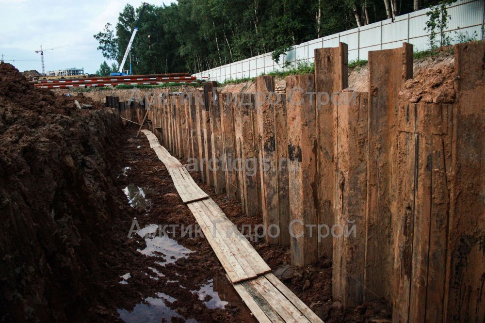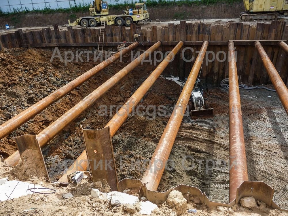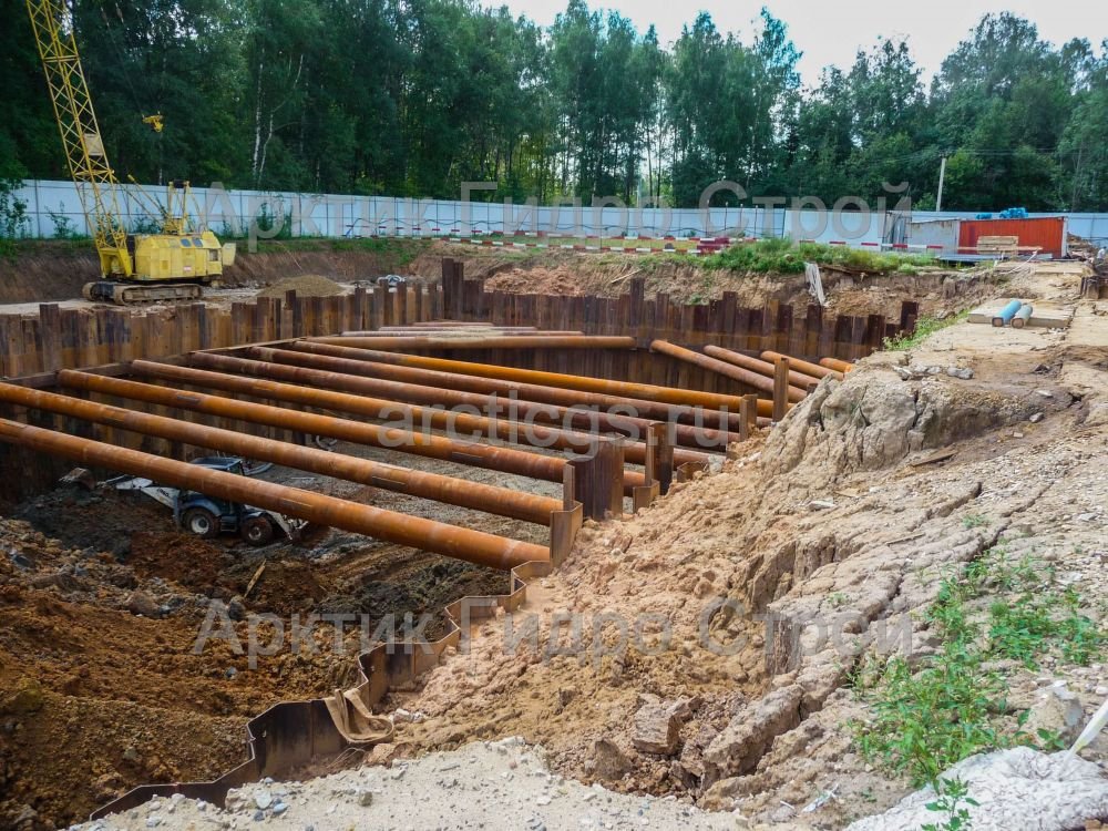 Выполненные работы:- разработка проекта на устройство конструкции крепления стенок котлована с применением системы шпунта Ларсена и распорной системы с применением двутавров и труб,