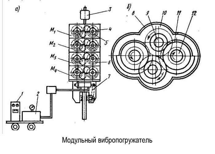 Еще один вариант конструкции – модульный погружатель. Его вибровозбудитель состоит из двух раздельных вальных блоков. Количество модулей регулируется, что делает установку подходящей для разных условий работы.