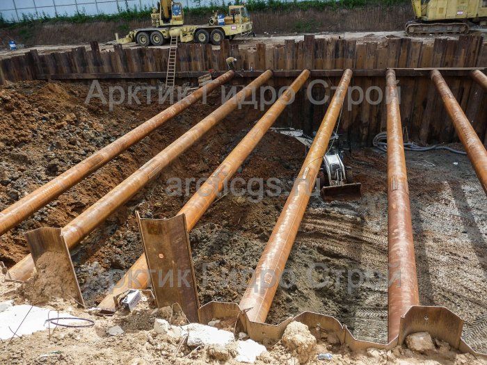 Шпунтовое ограждение котлована из шпунта Ларсена с распорами, выполненное специалистами «АрктикГидроСтрой»