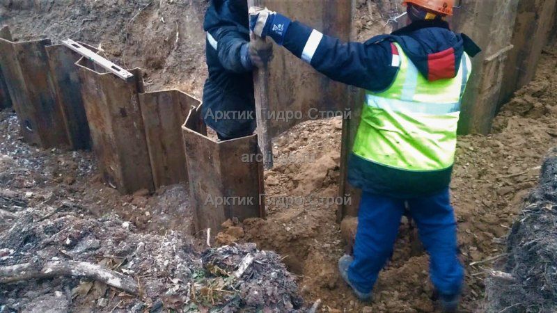 Шпунтовое ограждение котлована из шпунта Ларсена с распорами, выполненное специалистами «АрктикГидроСтрой»