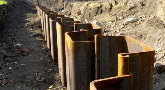 Для укрепления траншей при производстве земляных работ оптимальным вариантом являются металлические сваи, поскольку их можно демонтировать и повторно использовать до 20 раз. Наиболее востребован шпунт Ларсена с замками для соединения элементов. Полученное ограждение выдерживает значительные нагрузки, защищает траншей даже на плавунах, обводненных почвах.