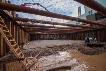 Для усиления применяется распорная система. На 6-метровой глубине при ширине котлована 8-12 м в этом качестве используются стальные трубы сечением 40-60 см. При дальнейшем увеличении глубины – 2 уровня распорок, 3 или больше.